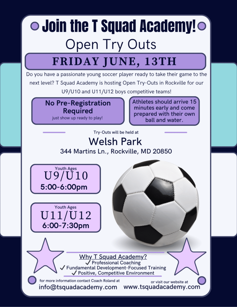 Our soccer program is designed for players who are ready to develop their skills in a structured, team-focused environment. T. Squad Academy teams compete in leagues across Montgomery County throughout the year, emphasizing fundamentals, game awareness, and consistent development.